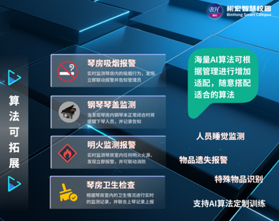 海量 AI 算法可根据实际管理需求进行增加与适配,能够随意搭配适合的算法,如人员睡觉监测、物品遗失报警、特殊物品识别等。同时,支持 AI 算法定制训练,可根据不同琴房的独特管理要求,定制专属的算法模型,为琴房管理给予更具针对性的服务。